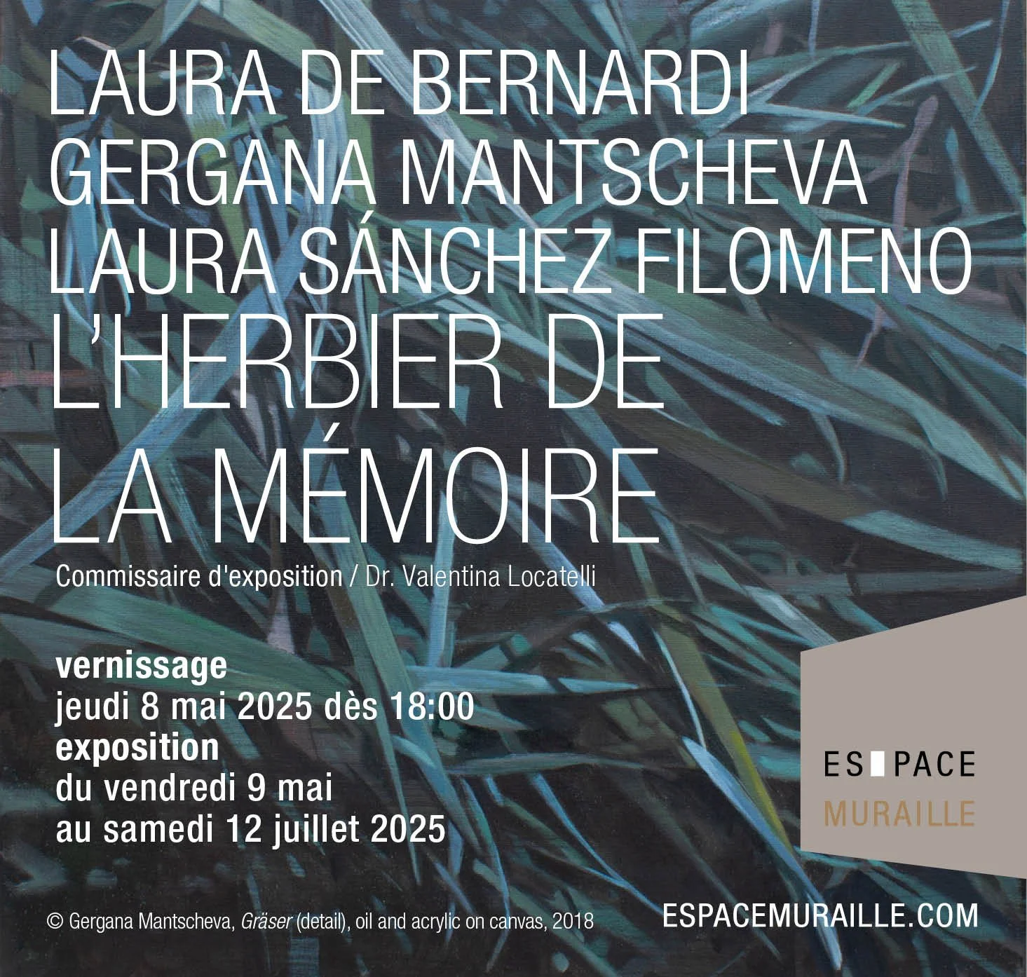 On the occasion of the exhibition The Herbarium of Memory at Espace Muraille, the works by Laura De Bernardi, Gergana Mantscheva and Laura Sánchez Filomeno are presented as if they were heterogeneous specimens borrowed from different herbaria for the purpose of comparing and investigating three geographically and culturally distinct yet related botanical collections.